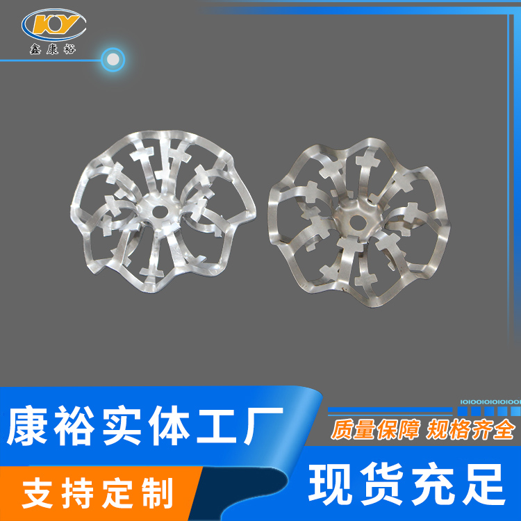 鋁花環填料主要材質為鋁合金,產品采用鋁合金板沖壓制成,外觀為橢球狀填料,包括有由一塊板材一體成型內環和外環,該內環與外環之間連接有筋,所有筋是由上半圓環筋和下半圓環筋構成,每兩相鄰筋由上半圓環筋和下半圓環筋交錯排列。這樣具有比表面積大,單位重量輕。產品除具有一般的通量大、不易被堵塞、通量大、阻力小、壓降低等優點外,還由于填料的空隙處能有較高的持液量,可使塔內液體的停留時間較長,從而增加了氣液兩相的接觸時間,提高了填料的傳質效率。